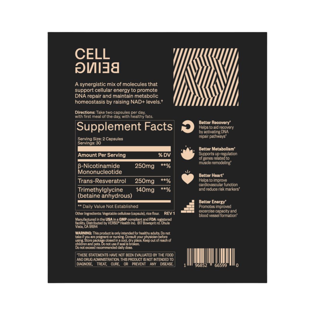 VERSO Cell Being is a combination of NMN, Resveratrol and TMG - a synergistic mix of molecules that support cellular energy to promote DNA repair and maintain metabolic homeostasis by raising NAD+ levels.